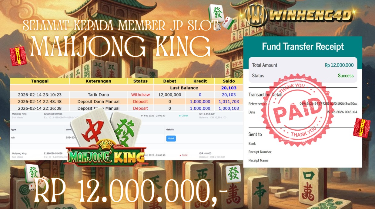 Selamat kepada User ID : WON***WOO7 Telah berhasil mendapatkan kemenangan besar pada Permainan JP SLOT MAHJONG KING Dengan kemenangan Sebesar Rp 12.000.000,- Setelah mengisi formulir withdraw dengan kurung waktu hanya 5-10 menit pihak WINHENG4D sudah melakukan transfer kepada pemilik User ID dan dana sudah dapat di cairkan oleh pemenang. Bukti pembayaran yang kami berikan merupakan bukti pembayaran yang SAH / VALID yang langung di dapatkan melaui tanda transfer transaksi dari Bank yang di tuju.