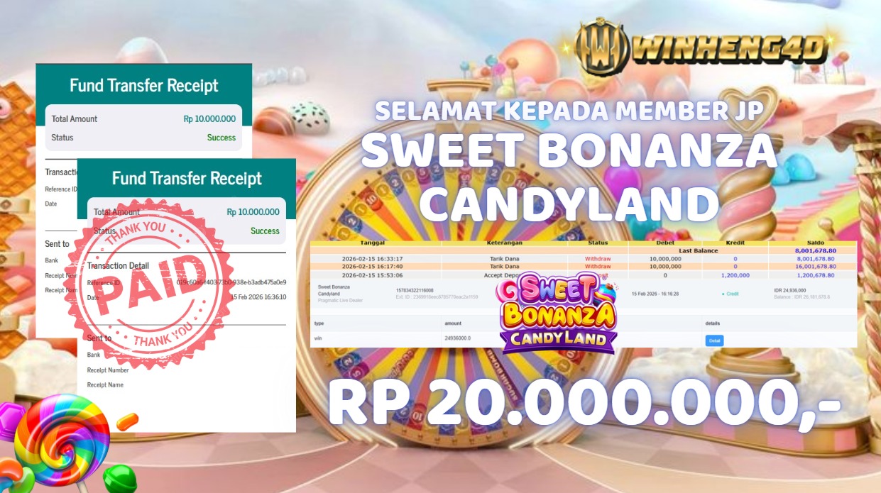 Selamat kepada User ID : SOP***IA Telah berhasil mendapatkan kemenangan besar pada Permainan JP SWEET BONANZA CANDYLAND Dengan kemenangan Sebesar Rp 20.000.000,- Setelah mengisi formulir withdraw dengan kurung waktu hanya 5-10 menit pihak WINHENG4D sudah melakukan transfer kepada pemilik User ID dan dana sudah dapat di cairkan oleh pemenang. Bukti pembayaran yang kami berikan merupakan bukti pembayaran yang SAH / VALID yang langung di dapatkan melaui tanda transfer transaksi dari Bank yang di tuju.