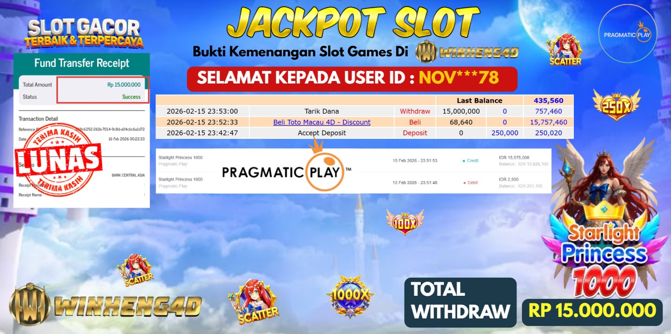 Selamat kepada User ID : JUNJUY***88 Telah berhasil mendapatkan kemenangan besar pada Permainan JP SLOT STARLIGHT PRINCESS 1000 Dengan kemenangan Sebesar Rp 15.000.000,- Setelah mengisi formulir withdraw dengan kurung waktu hanya 5-10 menit pihak WINHENG4D sudah melakukan transfer kepada pemilik User ID dan dana sudah dapat di cairkan oleh pemenang. Bukti pembayaran yang kami berikan merupakan bukti pembayaran yang SAH / VALID yang langung di dapatkan melaui tanda transfer transaksi dari Bank yang di tuju.