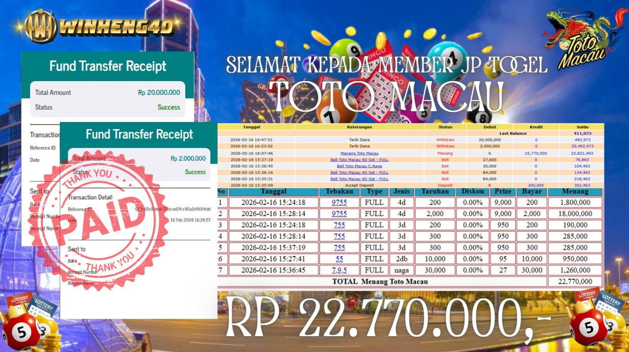 Selamat kepada User ID : JAR***W3 Telah berhasil mendapatkan kemenangan besar pada Permainan JP TOGEL TOTO MACAU Dengan kemenangan Sebesar Rp 22.770.000,- Setelah mengisi formulir withdraw dengan kurung waktu hanya 5-10 menit pihak WINHENG4D sudah melakukan transfer kepada pemilik User ID dan dana sudah dapat di cairkan oleh pemenang. Bukti pembayaran yang kami berikan merupakan bukti pembayaran yang SAH / VALID yang langung di dapatkan melaui tanda transfer transaksi dari Bank yang di tuju.