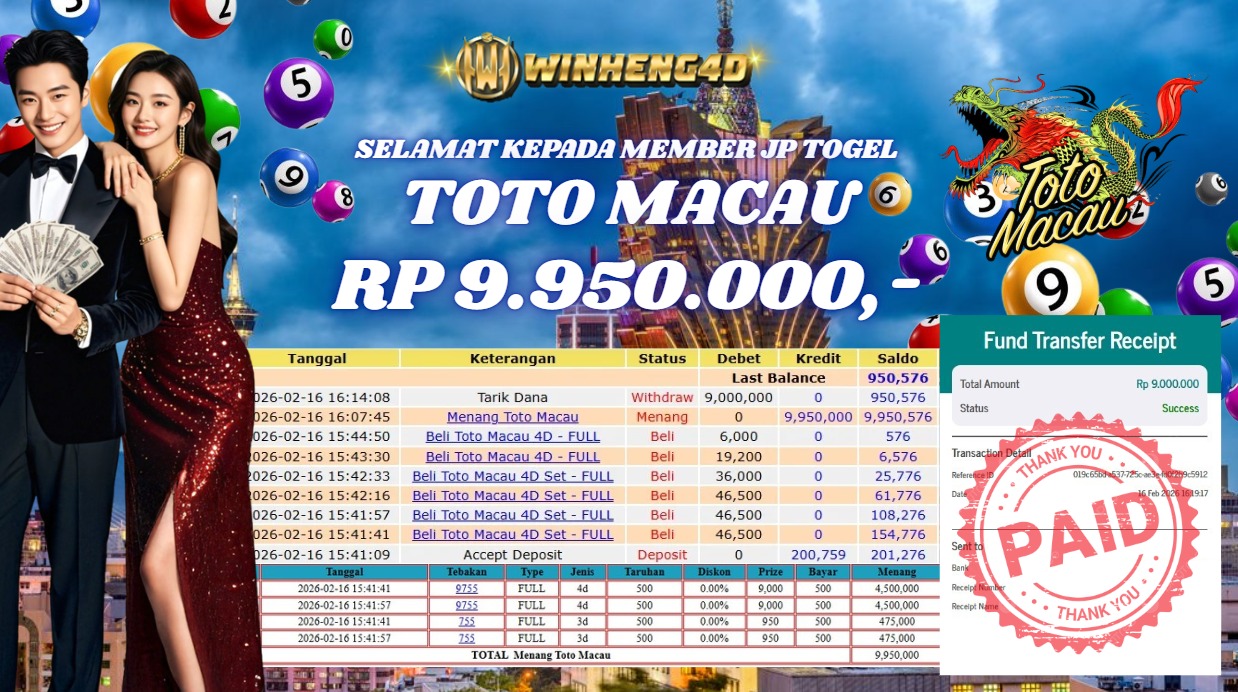 Selamat kepada User ID : SIA***KE Telah berhasil mendapatkan kemenangan besar pada Permainan JP TOGEL TOTO MACAU Dengan kemenangan Sebesar Rp 9.950.000,- Setelah mengisi formulir withdraw dengan kurung waktu hanya 5-10 menit pihak WINHENG4D sudah melakukan transfer kepada pemilik User ID dan dana sudah dapat di cairkan oleh pemenang. Bukti pembayaran yang kami berikan merupakan bukti pembayaran yang SAH / VALID yang langung di dapatkan melaui tanda transfer transaksi dari Bank yang di tuju.