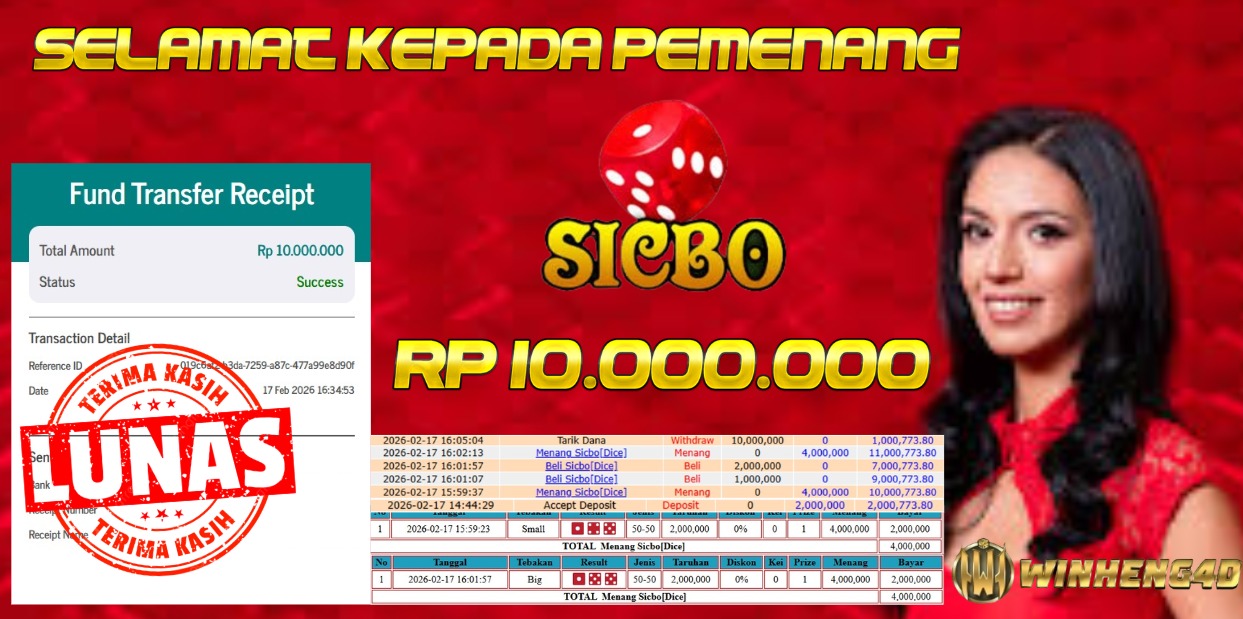 Selamat kepada User ID : ROB***IN77 Telah berhasil mendapatkan kemenangan besar pada Permainan JP LIVE GAME SICBO Dengan kemenangan Sebesar Rp 10.000.000,- Setelah mengisi formulir withdraw dengan kurung waktu hanya 5-10 menit pihak WINHENG4D sudah melakukan transfer kepada pemilik User ID dan dana sudah dapat di cairkan oleh pemenang. Bukti pembayaran yang kami berikan merupakan bukti pembayaran yang SAH / VALID yang langung di dapatkan melaui tanda transfer transaksi dari Bank yang di tuju.
