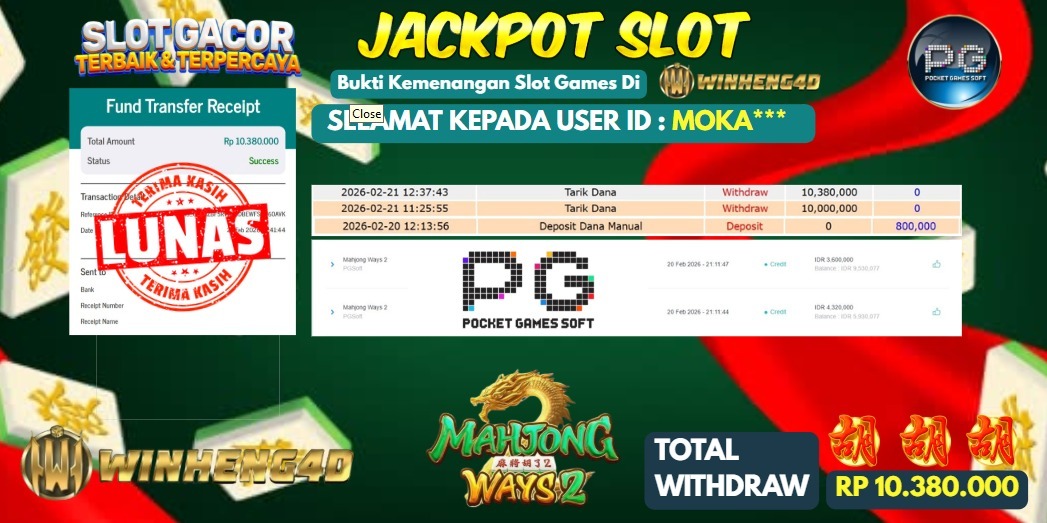 Selamat kepada User ID : MOKA***Telah berhasil mendapatkan kemenangan besar pada Permainan JP SLOT MAHJONG WAYS Dengan kemenangan Sebesar Rp 10.380.000,- Setelah mengisi formulir withdraw dengan kurung waktu hanya 5-10 menit pihak WINHENG4D sudah melakukan transfer kepada pemilik User ID dan dana sudah dapat di cairkan oleh pemenang. Bukti pembayaran yang kami berikan merupakan bukti pembayaran yang SAH / VALID yang langung di dapatkan melaui tanda transfer transaksi dari Bank yang di tuju.