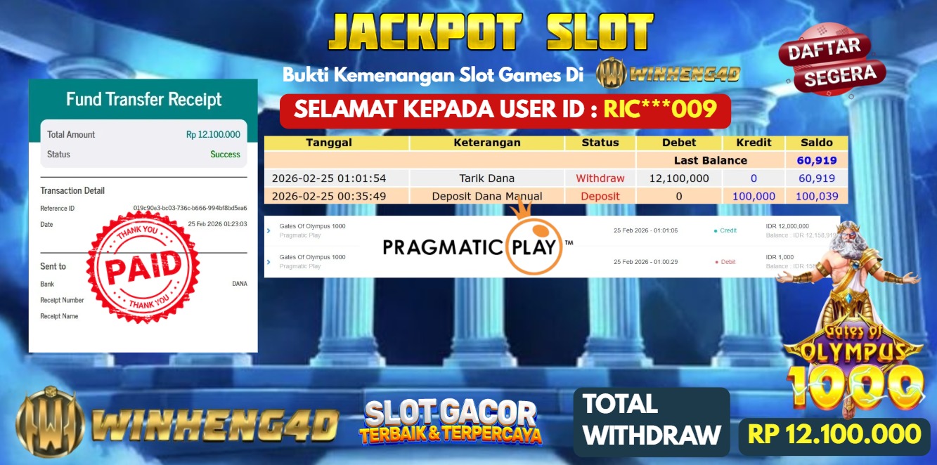 Selamat kepada User ID : RIC***009 Telah berhasil mendapatkan kemenangan besar pada Permainan JP SLOT GATES OF OLYMPUS 1000 Dengan … Baca selengkapnya...