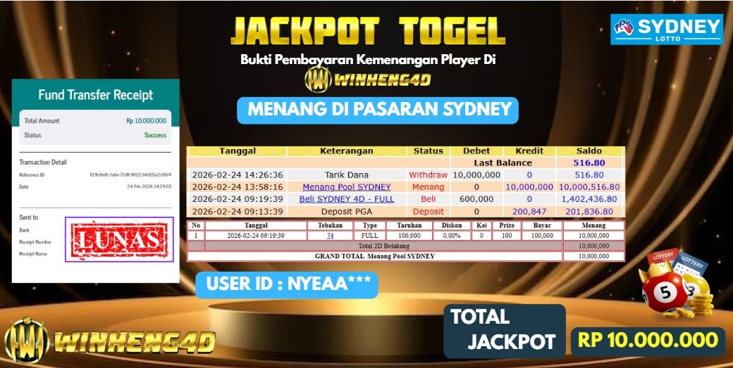 Selamat kepada User ID : NYEA***A Telah berhasil mendapatkan kemenangan besar pada Permainan JP TOGEL SYDNEY LOTTO Dengan kemenangan Sebesar … Baca selengkapnya...