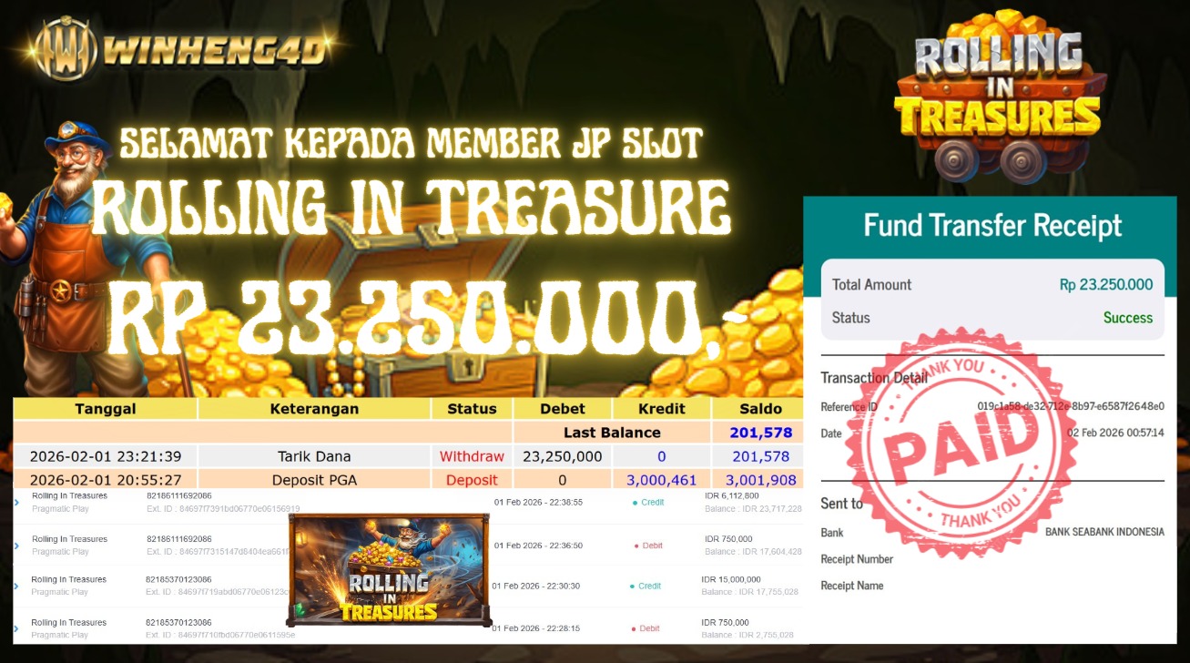Selamat kepada User ID : MEL***NNI Telah berhasil mendapatkan kemenangan besar pada Permainan JP SLOT ROLLING IN TREASURES Dengan kemenangan … Baca selengkapnya...