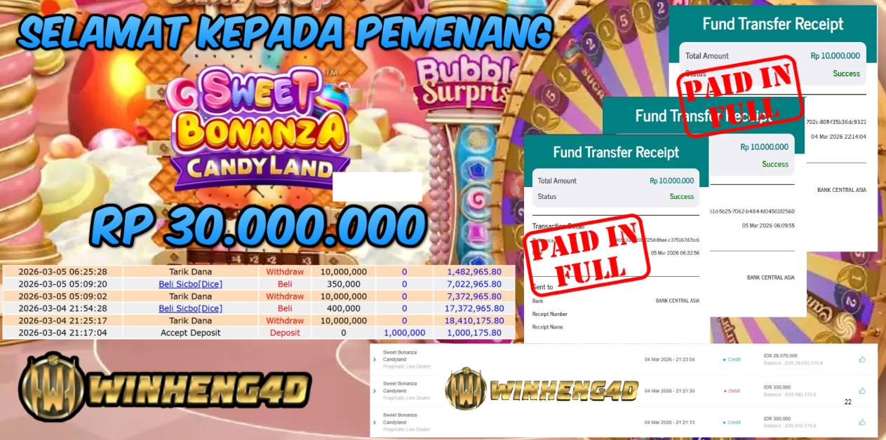 Selamat kepada User ID : RUNE***REZ Telah berhasil mendapatkan kemenangan besar pada Permainan JP SWEET BONANZA CANDYLAND Dengan kemenangan Sebesar Rp 30.000.000,- Setelah mengisi formulir withdraw dengan kurung waktu hanya 5-10 menit pihak WINHENG4D sudah melakukan transfer kepada pemilik User ID dan dana sudah dapat di cairkan oleh pemenang. Bukti pembayaran yang kami berikan merupakan bukti pembayaran yang SAH / VALID yang langung di dapatkan melaui tanda transfer transaksi dari Bank yang di tuju.