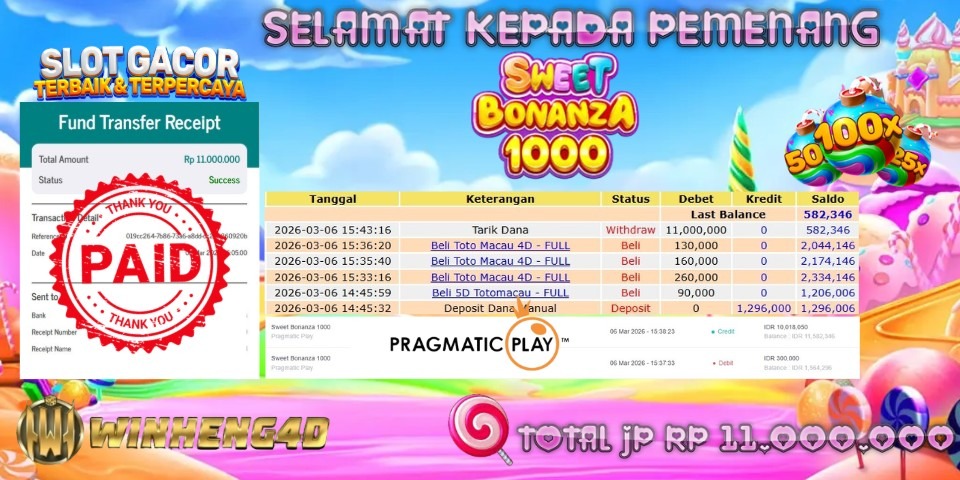 Selamat kepada User ID : SIBOSSSS*** Telah berhasil mendapatkan kemenangan besar pada Permainan JP SWEET BONANZA 1000 Dengan kemenangan Sebesar Rp 11.000.000,- Setelah mengisi formulir withdraw dengan kurung waktu hanya 5-10 menit pihak WINHENG4D sudah melakukan transfer kepada pemilik User ID dan dana sudah dapat di cairkan oleh pemenang. Bukti pembayaran yang kami berikan merupakan bukti pembayaran yang SAH / VALID yang langung di dapatkan melaui tanda transfer transaksi dari Bank yang di tuju.