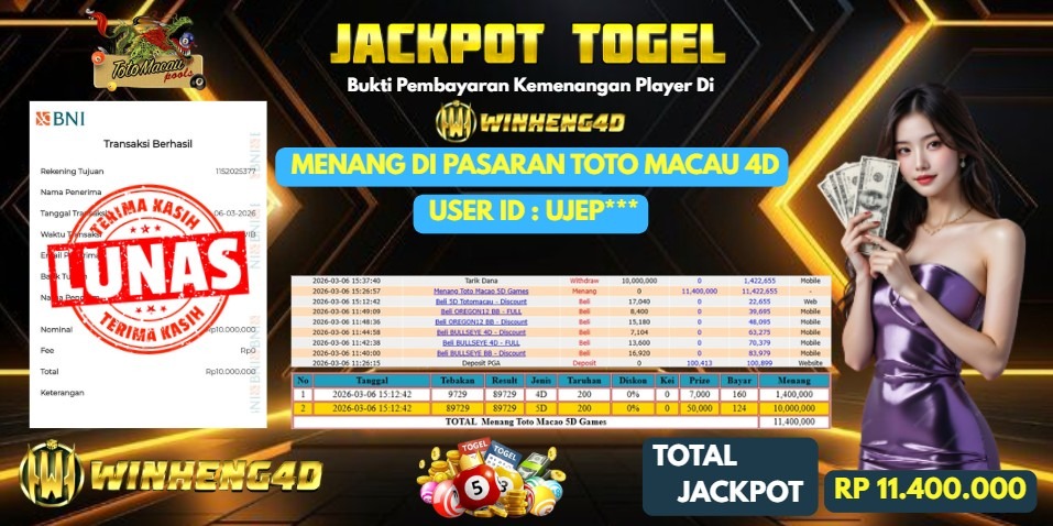 Selamat kepada User ID : UJEP*** Telah berhasil mendapatkan kemenangan besar pada Permainan JP TOGEL TOTO MACAU Dengan kemenangan Sebesar Rp 11.400.000,- Setelah mengisi formulir withdraw dengan kurung waktu hanya 5-10 menit pihak WINHENG4D sudah melakukan transfer kepada pemilik User ID dan dana sudah dapat di cairkan oleh pemenang. Bukti pembayaran yang kami berikan merupakan bukti pembayaran yang SAH / VALID yang langung di dapatkan melaui tanda transfer transaksi dari Bank yang di tuju.