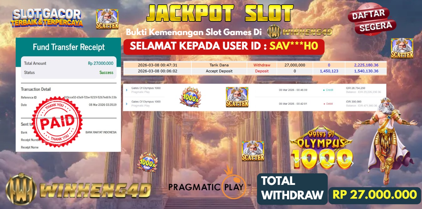 Selamat kepada User ID : SAV***HO Telah berhasil mendapatkan kemenangan besar pada Permainan JP SLOT GATES OF OLYMPUS 1000 Dengan kemenangan Sebesar Rp 27.000.000,- Setelah mengisi formulir withdraw dengan kurung waktu hanya 5-10 menit pihak WINHENG4D sudah melakukan transfer kepada pemilik User ID dan dana sudah dapat di cairkan oleh pemenang. Bukti pembayaran yang kami berikan merupakan bukti pembayaran yang SAH / VALID yang langung di dapatkan melaui tanda transfer transaksi dari Bank yang di tuju.