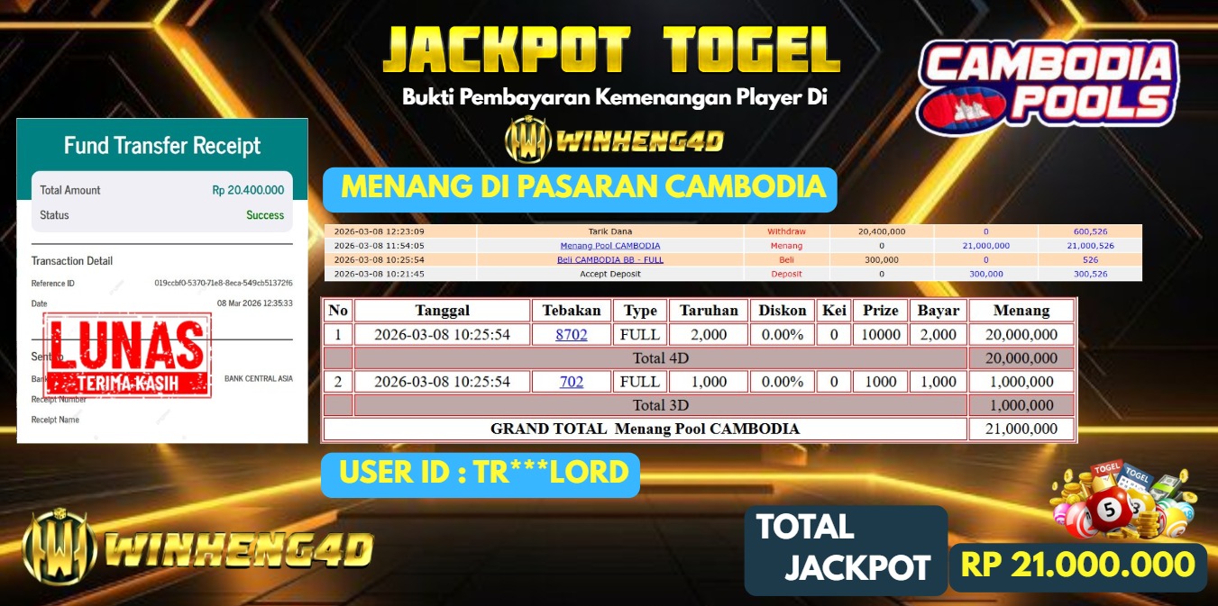 Selamat kepada User ID : TR***LORD Telah berhasil mendapatkan kemenangan besar pada Permainan JP TOGEL CAMBODIA Dengan kemenangan Sebesar Rp … Baca selengkapnya...
