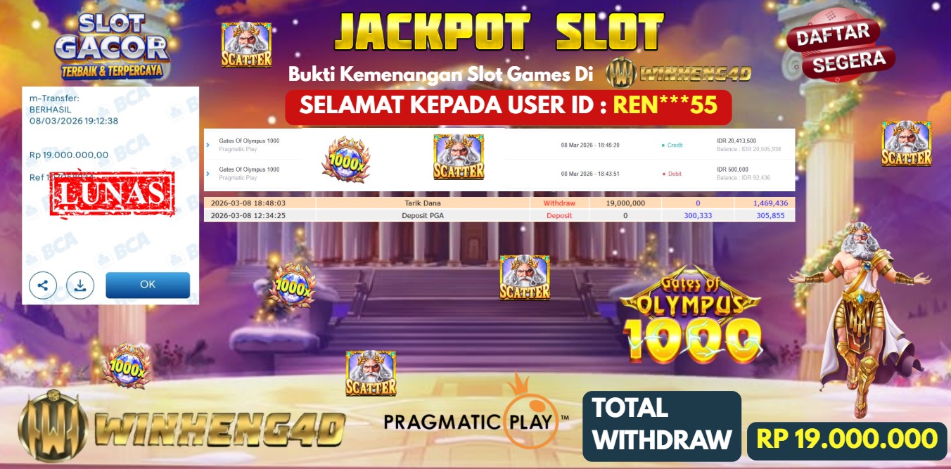 Selamat kepada User ID : REN***55 Telah berhasil mendapatkan kemenangan besar pada Permainan JP SLOT GATES OF OLYMPUS 1000 Dengan kemenangan Sebesar Rp 19.000.000,- Setelah mengisi formulir withdraw dengan kurung waktu hanya 5-10 menit pihak WINHENG4D sudah melakukan transfer kepada pemilik User ID dan dana sudah dapat di cairkan oleh pemenang. Bukti pembayaran yang kami berikan merupakan bukti pembayaran yang SAH / VALID yang langung di dapatkan melaui tanda transfer transaksi dari Bank yang di tuju.