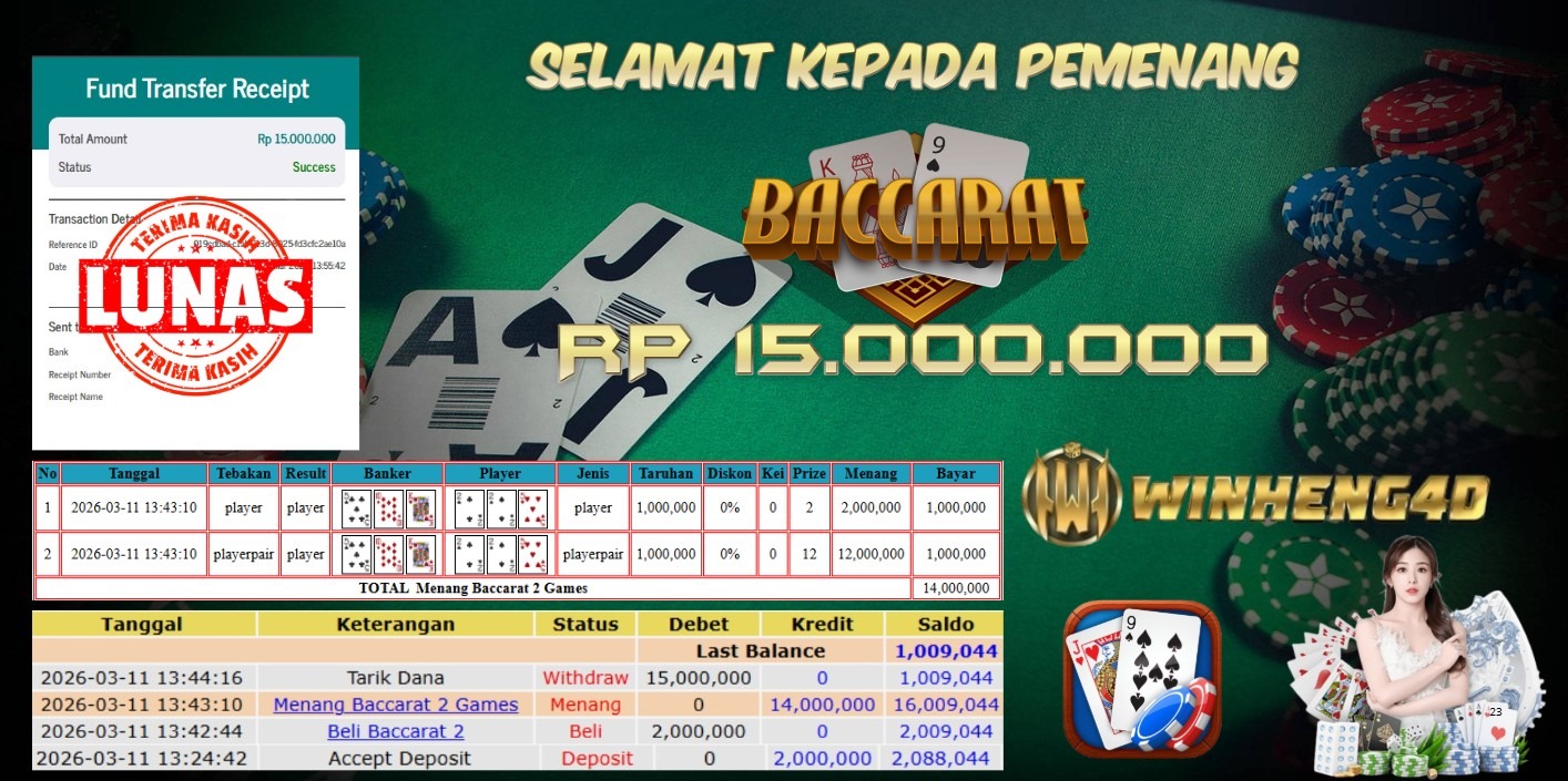 Selamat kepada User ID : MBUT00** Telah berhasil mendapatkan kemenangan besar pada Permainan JP LIVE GAME BACCARAT Dengan kemenangan Sebesar Rp 15.000.000,- Setelah mengisi formulir withdraw dengan kurung waktu hanya 5-10 menit pihak WINHENG4D sudah melakukan transfer kepada pemilik User ID dan dana sudah dapat di cairkan oleh pemenang. Bukti pembayaran yang kami berikan merupakan bukti pembayaran yang SAH / VALID yang langung di dapatkan melaui tanda transfer transaksi dari Bank yang di tuju.