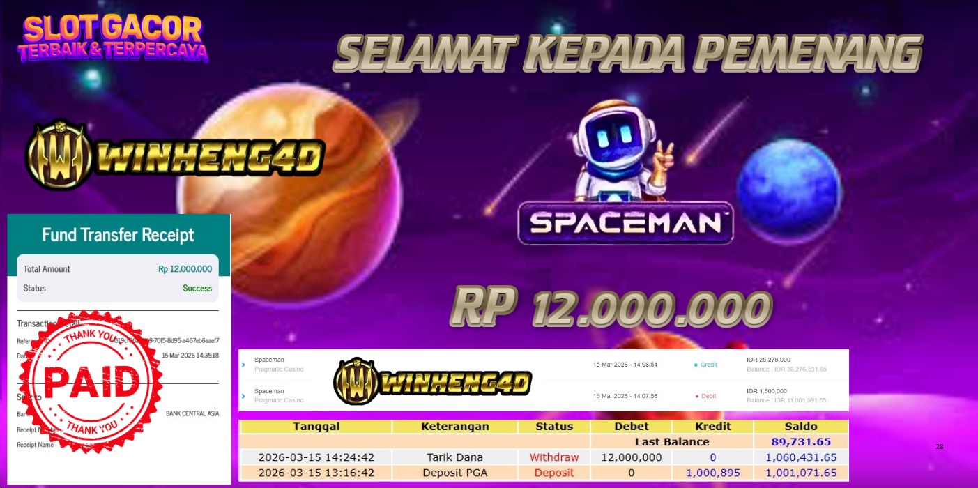 Selamat kepada User ID : JHON***JU Telah berhasil mendapatkan kemenangan besar pada Permainan JP SPACEMAN Dengan kemenangan Sebesar Rp 12.000.000,- Setelah mengisi formulir withdraw dengan kurung waktu hanya 5-10 menit pihak WINHENG4D sudah melakukan transfer kepada pemilik User ID dan dana sudah dapat di cairkan oleh pemenang. Bukti pembayaran yang kami berikan merupakan bukti pembayaran yang SAH / VALID yang langung di dapatkan melaui tanda transfer transaksi dari Bank yang di tuju.