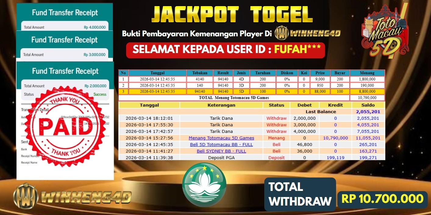 Selamat kepada User ID : FUFAH*** Telah berhasil mendapatkan kemenangan besar pada Permainan JP TOGEL TOTO MACAU 5D Dengan kemenangan Sebesar Rp 10.700.000,- Setelah mengisi formulir withdraw dengan kurung waktu hanya 5-10 menit pihak WINHENG4D sudah melakukan transfer kepada pemilik User ID dan dana sudah dapat di cairkan oleh pemenang. Bukti pembayaran yang kami berikan merupakan bukti pembayaran yang SAH / VALID yang langung di dapatkan melaui tanda transfer transaksi dari Bank yang di tuju.