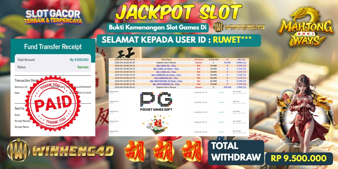 Selamat kepada User ID : RUWET*** Telah berhasil mendapatkan kemenangan besar pada Permainan JP SLOT MAHJONG WAYS Dengan kemenangan Sebesar Rp 9.500.000,- Setelah mengisi formulir withdraw dengan kurung waktu hanya 5-10 menit pihak WINHENG4D sudah melakukan transfer kepada pemilik User ID dan dana sudah dapat di cairkan oleh pemenang. Bukti pembayaran yang kami berikan merupakan bukti pembayaran yang SAH / VALID yang langung di dapatkan melaui tanda transfer transaksi dari Bank yang di tuju.