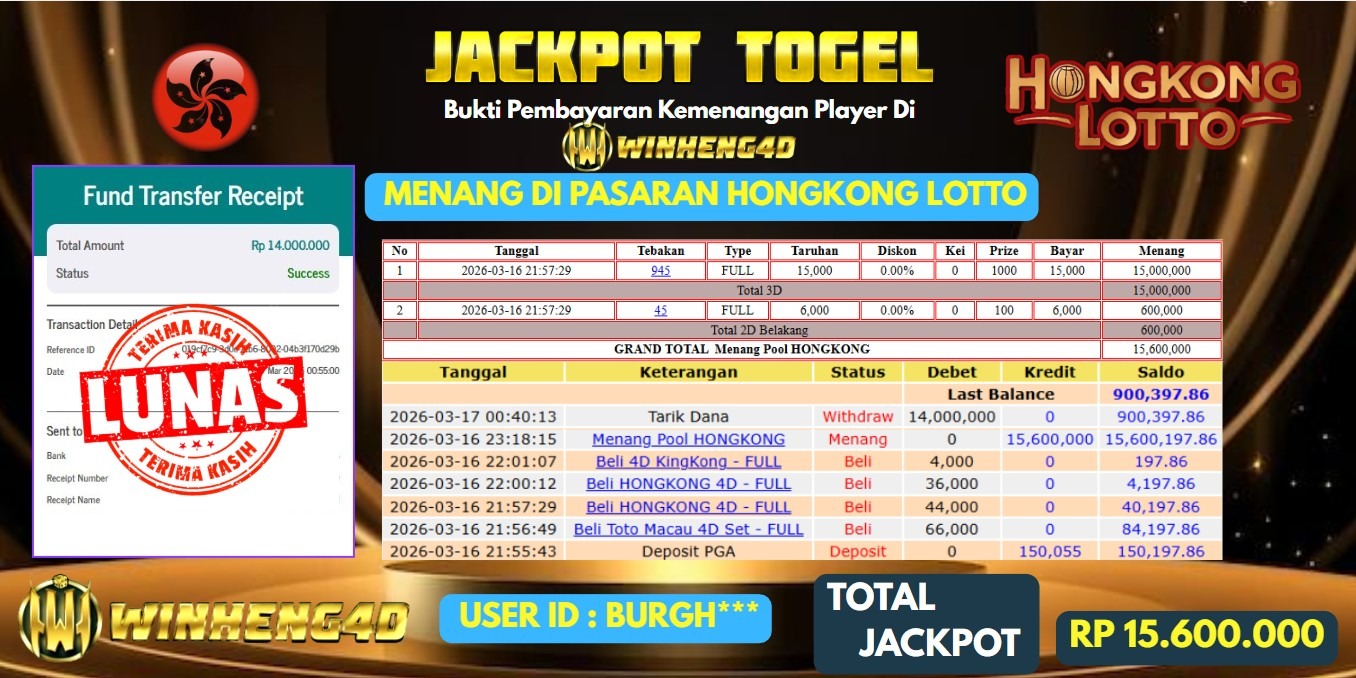 Selamat kepada User ID : BURGH*** Telah berhasil mendapatkan kemenangan besar pada Permainan JP TOGEL HONGKONG LOTTO Dengan kemenangan Sebesar Rp 15.600.000,- Setelah mengisi formulir withdraw dengan kurung waktu hanya 5-10 menit pihak WINHENG4D sudah melakukan transfer kepada pemilik User ID dan dana sudah dapat di cairkan oleh pemenang. Bukti pembayaran yang kami berikan merupakan bukti pembayaran yang SAH / VALID yang langung di dapatkan melaui tanda transfer transaksi dari Bank yang di tuju.