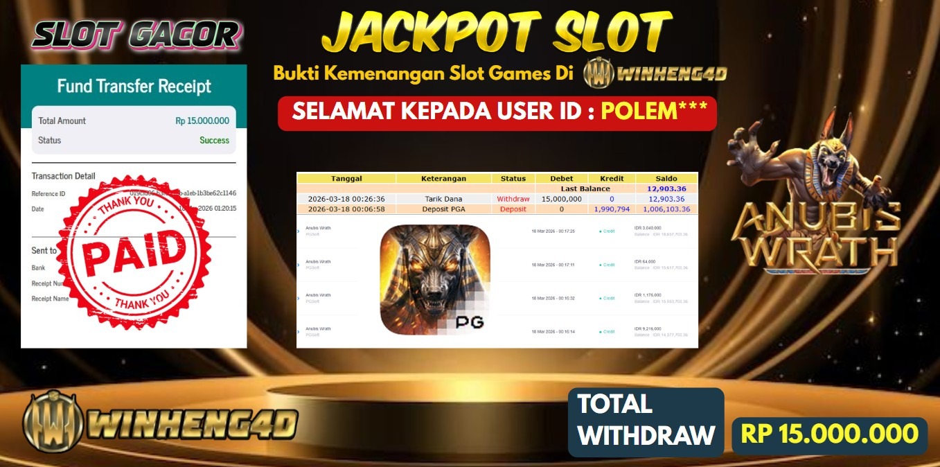 Selamat kepada User ID : POLEM*** Telah berhasil mendapatkan kemenangan besar pada Permainan JP SLOT GATES OF OLYMPUS SUPER SCATTER Dengan kemenangan Sebesar Rp 15.000.000,- Setelah mengisi formulir withdraw dengan kurung waktu hanya 5-10 menit pihak WINHENG4D sudah melakukan transfer kepada pemilik User ID dan dana sudah dapat di cairkan oleh pemenang. Bukti pembayaran yang kami berikan merupakan bukti pembayaran yang SAH / VALID yang langung di dapatkan melaui tanda transfer transaksi dari Bank yang di tuju.