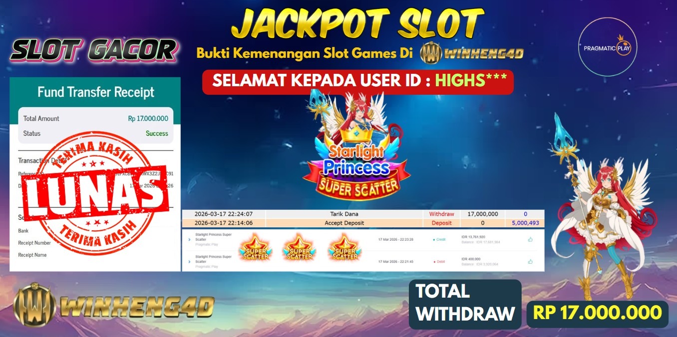 Selamat kepada User ID : HIGHS*** Telah berhasil mendapatkan kemenangan besar pada Permainan JP SLOT STARLIGHT PRINCESS SUPER SCATTER Dengan kemenangan Sebesar Rp 17.000.000,- Setelah mengisi formulir withdraw dengan kurung waktu hanya 5-10 menit pihak WINHENG4D sudah melakukan transfer kepada pemilik User ID dan dana sudah dapat di cairkan oleh pemenang. Bukti pembayaran yang kami berikan merupakan bukti pembayaran yang SAH / VALID yang langung di dapatkan melaui tanda transfer transaksi dari Bank yang di tuju.
