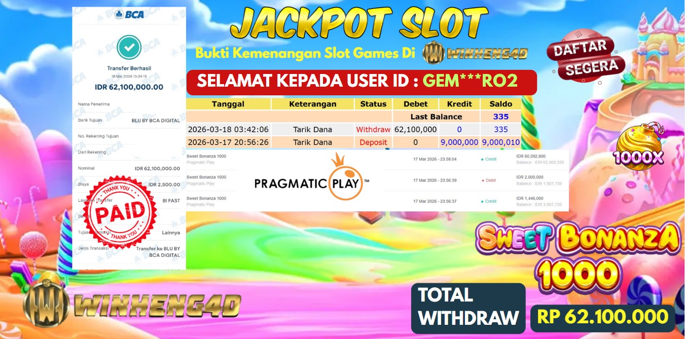 Selamat kepada User ID : GEM***RO2 Telah berhasil mendapatkan kemenangan besar pada Permainan JP SLOT SWEET BONANZA 1000 Dengan kemenangan Sebesar Rp 62.100.000,- Setelah mengisi formulir withdraw dengan kurung waktu hanya 5-10 menit pihak WINHENG4D sudah melakukan transfer kepada pemilik User ID dan dana sudah dapat di cairkan oleh pemenang. Bukti pembayaran yang kami berikan merupakan bukti pembayaran yang SAH / VALID yang langung di dapatkan melaui tanda transfer transaksi dari Bank yang di tuju.