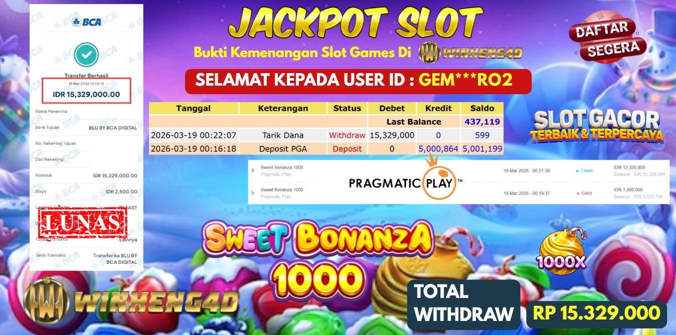 Selamat kepada User ID : GEM***RO2 Telah berhasil mendapatkan kemenangan besar pada Permainan JP SLOT SWEET BONANZA 1000 Dengan kemenangan Sebesar Rp 15.329.000,- Setelah mengisi formulir withdraw dengan kurung waktu hanya 5-10 menit pihak WINHENG4D sudah melakukan transfer kepada pemilik User ID dan dana sudah dapat di cairkan oleh pemenang. Bukti pembayaran yang kami berikan merupakan bukti pembayaran yang SAH / VALID yang langung di dapatkan melaui tanda transfer transaksi dari Bank yang di tuju.