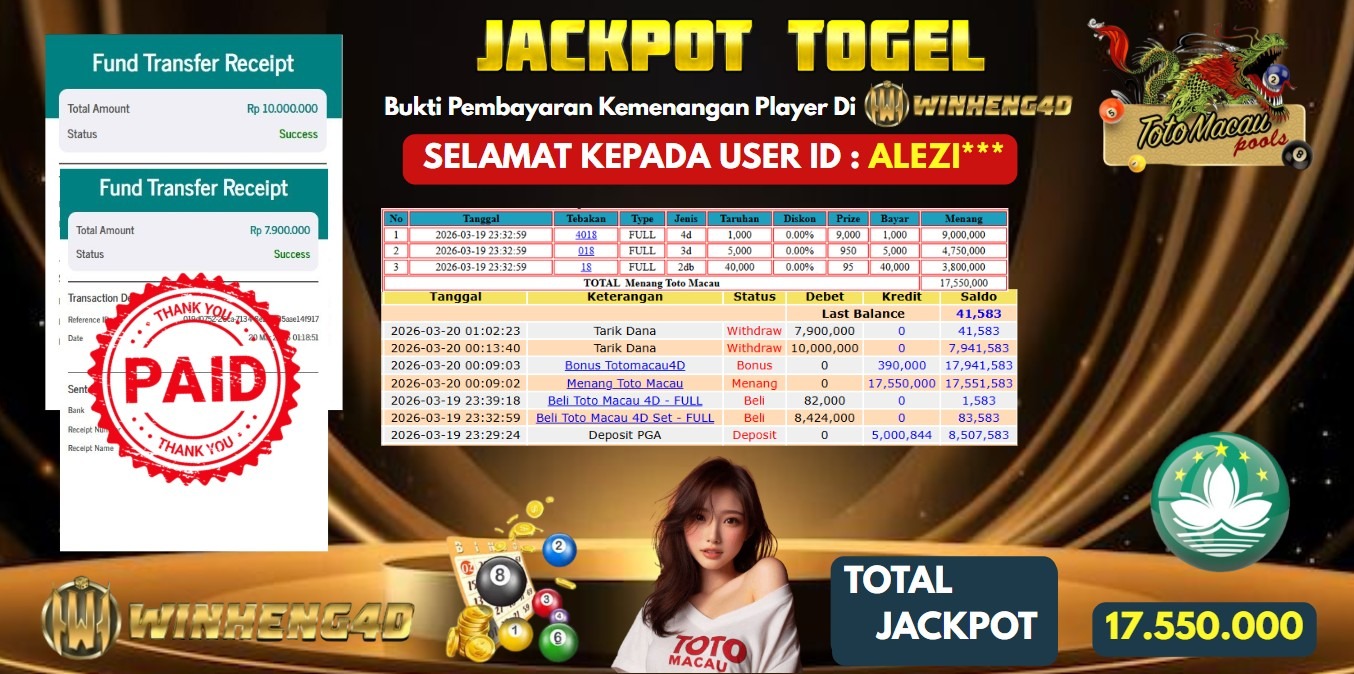 Selamat kepada User ID : ALEZI*** Telah berhasil mendapatkan kemenangan besar pada Permainan JP TOGEL TOTO MACAU Dengan kemenangan Sebesar Rp 17.550.000,- Setelah mengisi formulir withdraw dengan kurung waktu hanya 5-10 menit pihak WINHENG4D sudah melakukan transfer kepada pemilik User ID dan dana sudah dapat di cairkan oleh pemenang. Bukti pembayaran yang kami berikan merupakan bukti pembayaran yang SAH / VALID yang langung di dapatkan melaui tanda transfer transaksi dari Bank yang di tuju.