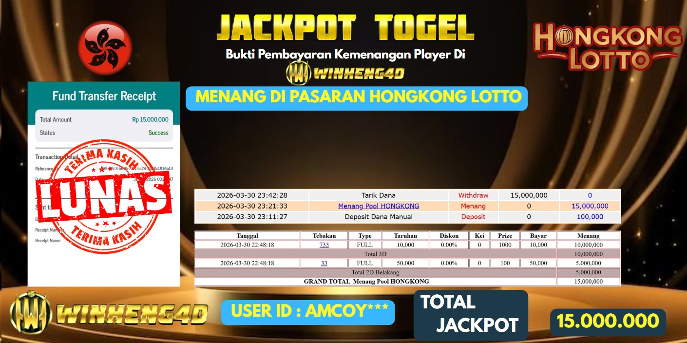 Selamat kepada User ID : AMCOY*** Telah berhasil mendapatkan kemenangan besar pada Permainan JP TOGEL HONGKONG LOTTO Dengan kemenangan Sebesar … Baca selengkapnya...