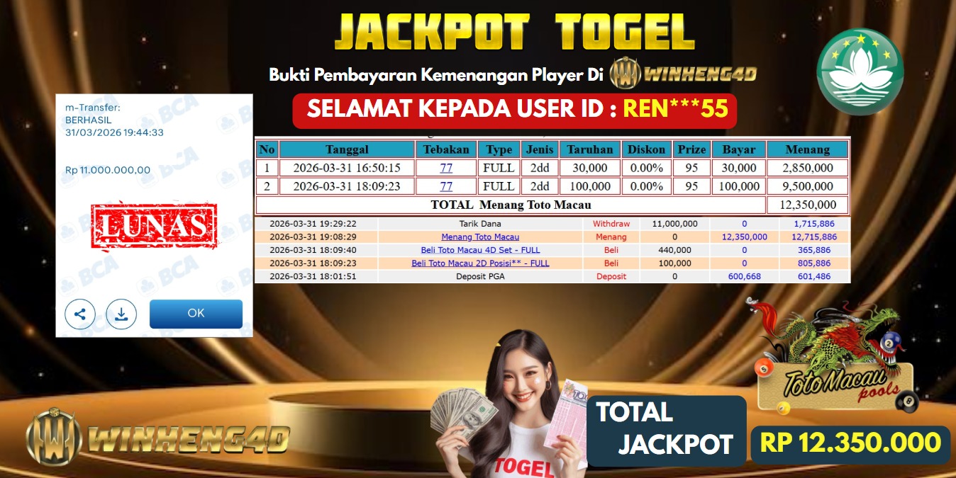 Selamat kepada User ID : REN***55 Telah berhasil mendapatkan kemenangan besar pada Permainan JP TOGEL TOTO MACAU Dengan kemenangan Sebesar Rp 12.350.000,- Setelah mengisi formulir withdraw dengan kurung waktu hanya 5-10 menit pihak WINHENG4D sudah melakukan transfer kepada pemilik User ID dan dana sudah dapat di cairkan oleh pemenang. Bukti pembayaran yang kami berikan merupakan bukti pembayaran yang SAH / VALID yang langung di dapatkan melaui tanda transfer transaksi dari Bank yang di tuju.