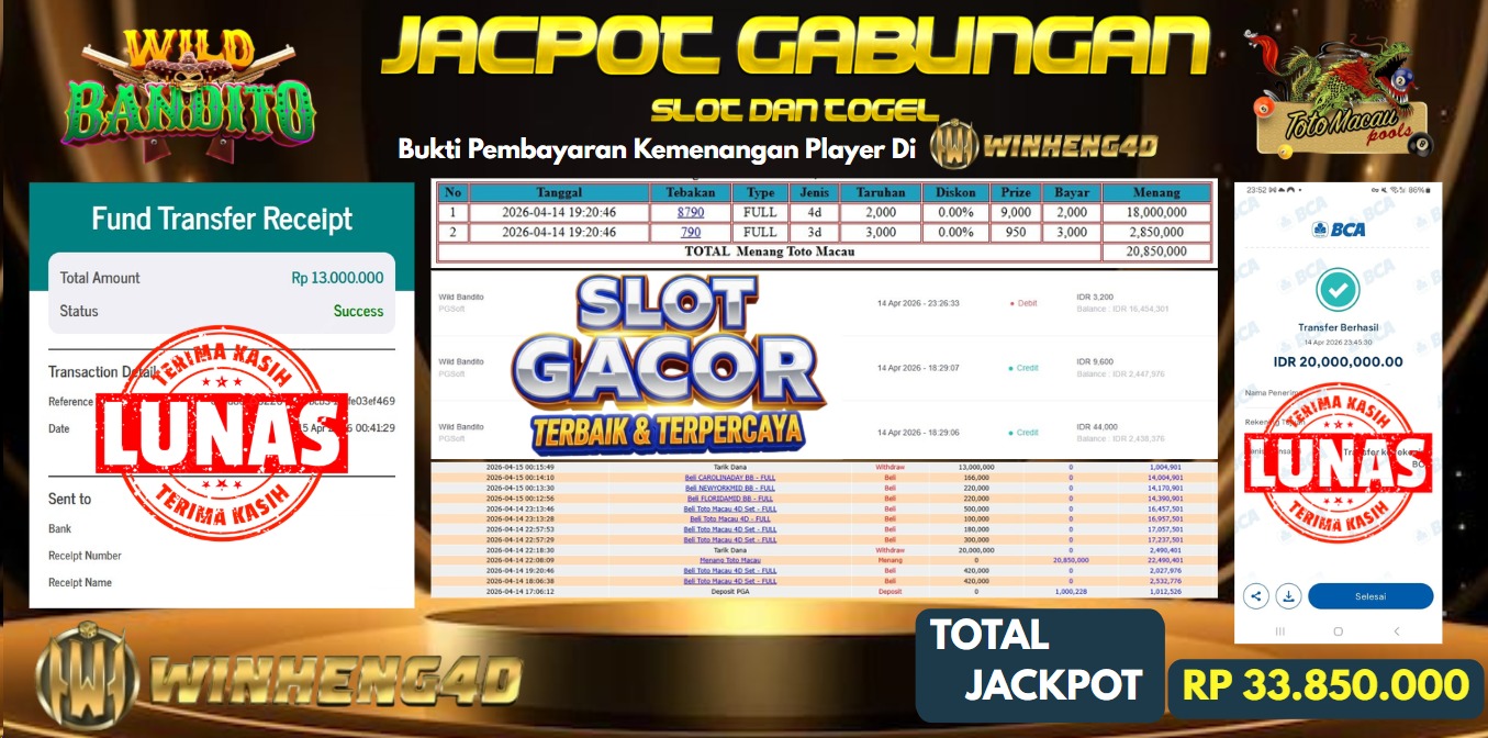 Selamat kepada User ID : RND55*** Telah berhasil mendapatkan kemenangan besar pada Permainan JP GABUNGAN TOTO MACAU DAN WILD BANDITO Dengan kemenangan Sebesar Rp 33.850.000,- Setelah mengisi formulir withdraw dengan kurung waktu hanya 5-10 menit pihak WINHENG4D sudah melakukan transfer kepada pemilik User ID dan dana sudah dapat di cairkan oleh pemenang. Bukti pembayaran yang kami berikan merupakan bukti pembayaran yang SAH / VALID yang langung di dapatkan melaui tanda transfer transaksi dari Bank yang di tuju.