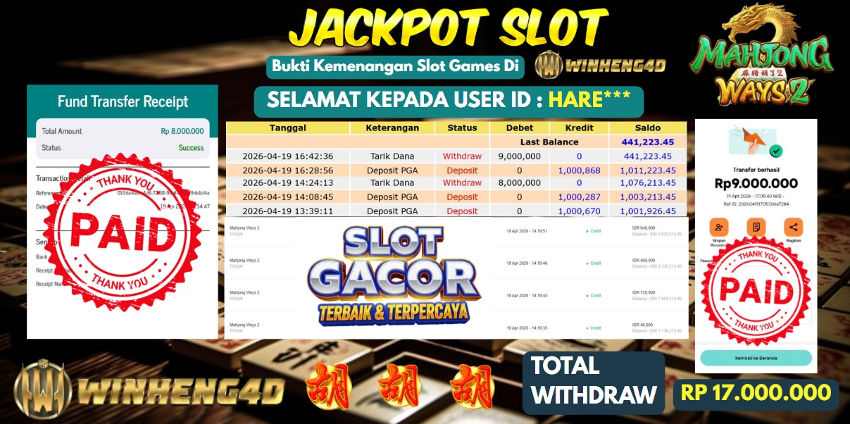 Selamat kepada User ID : HARE*** Telah berhasil mendapatkan kemenangan besar pada Permainan JP SLOT MAHJONG WAYS 2 Dengan kemenangan Sebesar Rp 17.000.000,- Setelah mengisi formulir withdraw dengan kurung waktu hanya 5-10 menit pihak WINHENG4D sudah melakukan transfer kepada pemilik User ID dan dana sudah dapat di cairkan oleh pemenang. Bukti pembayaran yang kami berikan merupakan bukti pembayaran yang SAH / VALID yang langung di dapatkan melaui tanda transfer transaksi dari Bank yang di tuju.