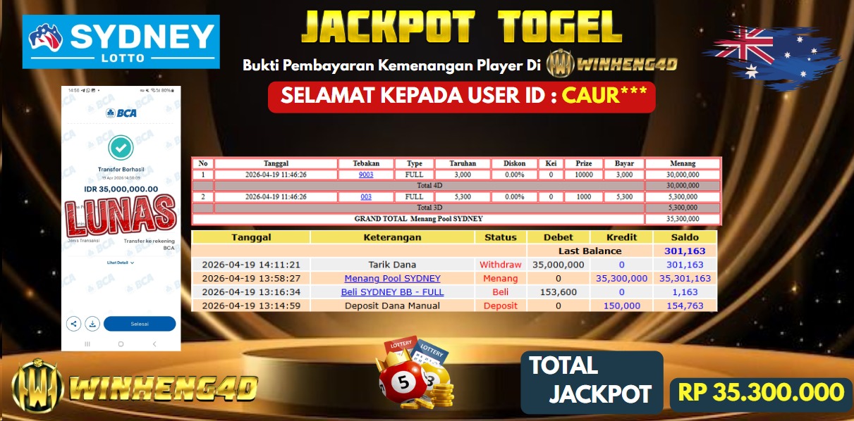 Selamat kepada User ID : CAUR*** Telah berhasil mendapatkan kemenangan besar pada Permainan JP TOGEL SYDNEY LOTTO Dengan kemenangan Sebesar Rp 35.300.000,- Setelah mengisi formulir withdraw dengan kurung waktu hanya 5-10 menit pihak WINHENG4D sudah melakukan transfer kepada pemilik User ID dan dana sudah dapat di cairkan oleh pemenang. Bukti pembayaran yang kami berikan merupakan bukti pembayaran yang SAH / VALID yang langung di dapatkan melaui tanda transfer transaksi dari Bank yang di tuju.