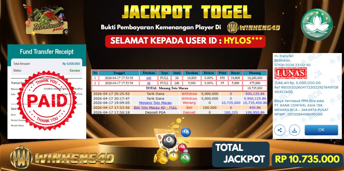 Selamat kepada User ID : HYLOS*** Telah berhasil mendapatkan kemenangan besar pada Permainan JP TOGEL TOTO MACAU Dengan kemenangan Sebesar Rp 10.735.000,- Setelah mengisi formulir withdraw dengan kurung waktu hanya 5-10 menit pihak WINHENG4D sudah melakukan transfer kepada pemilik User ID dan dana sudah dapat di cairkan oleh pemenang. Bukti pembayaran yang kami berikan merupakan bukti pembayaran yang SAH / VALID yang langung di dapatkan melaui tanda transfer transaksi dari Bank yang di tuju.