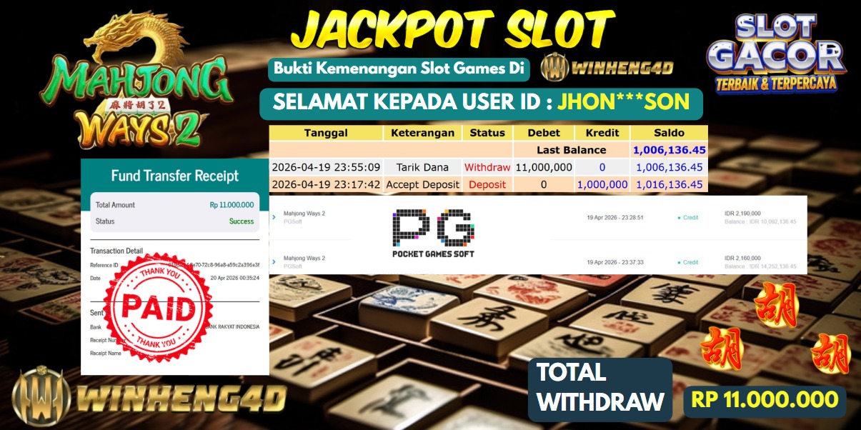 Selamat kepada User ID : JHON***SON Telah berhasil mendapatkan kemenangan besar pada Permainan JP SLOT MAHJONG WAYS 2 Dengan kemenangan Sebesar Rp 11.000.000,- Setelah mengisi formulir withdraw dengan kurung waktu hanya 5-10 menit pihak WINHENG4D sudah melakukan transfer kepada pemilik User ID dan dana sudah dapat di cairkan oleh pemenang. Bukti pembayaran yang kami berikan merupakan bukti pembayaran yang SAH / VALID yang langung di dapatkan melaui tanda transfer transaksi dari Bank yang di tuju.