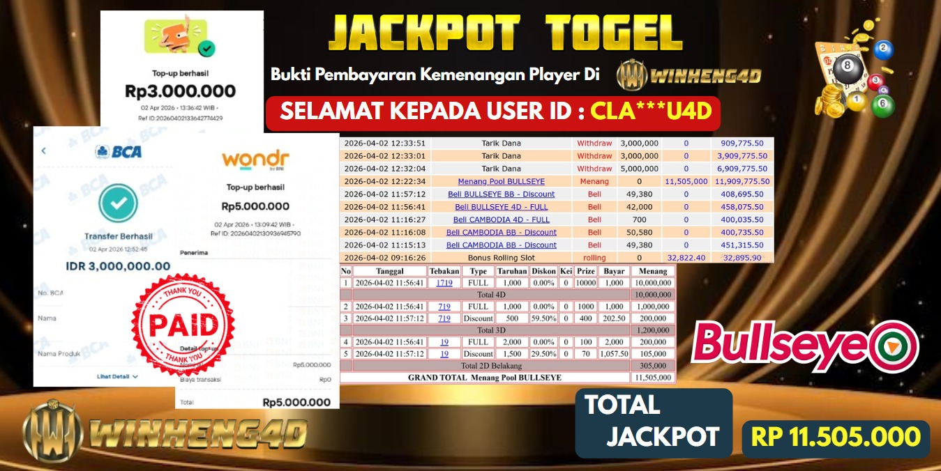 Selamat kepada User ID : CLA***U4D Telah berhasil mendapatkan kemenangan besar pada Permainan JP TOGEL BULLSEYE Dengan kemenangan Sebesar Rp … Baca selengkapnya...