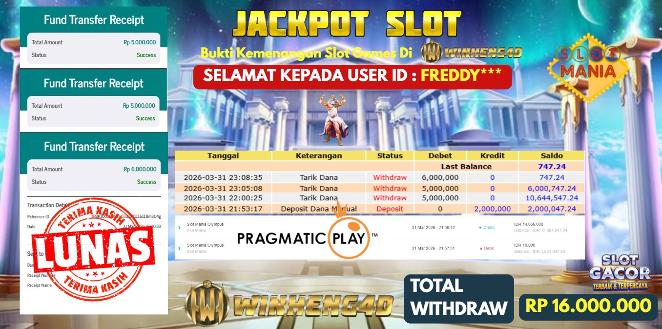 Selamat kepada User ID : FREDDY*** Telah berhasil mendapatkan kemenangan besar pada Permainan JP SLOT MANIA OLYMPUS Dengan kemenangan Sebesar … Baca selengkapnya...