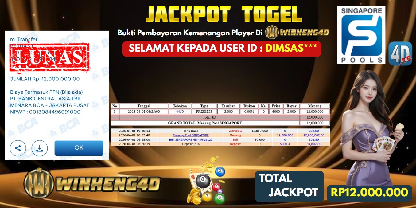Selamat kepada User ID : DIMSAS*** Telah berhasil mendapatkan kemenangan besar pada Permainan JP TOGEL SINGAPORE Dengan kemenangan Sebesar Rp … Baca selengkapnya...