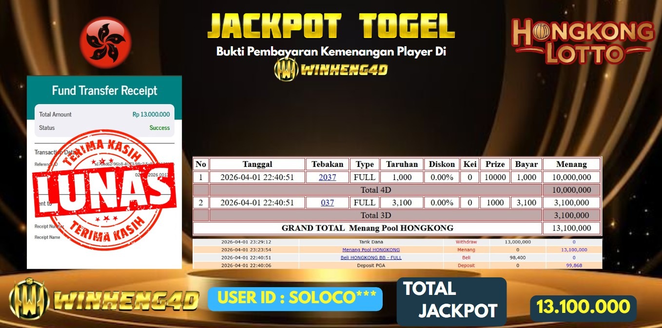 Selamat kepada User ID : SOLOCO*** Telah berhasil mendapatkan kemenangan besar pada Permainan JP TOGEL HONGKONG LOTTO Dengan kemenangan Sebesar … Baca selengkapnya...