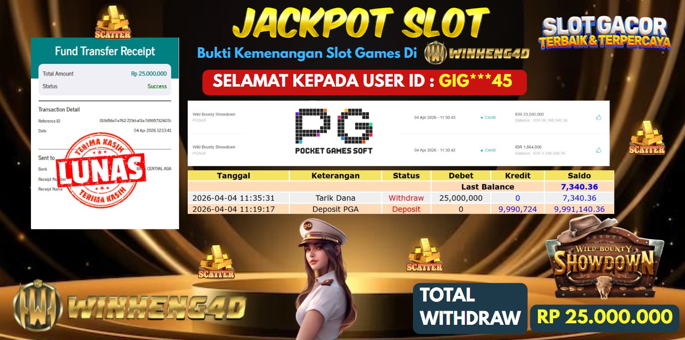 Selamat kepada User ID : GIG***45 Telah berhasil mendapatkan kemenangan besar pada Permainan JP SLOT WILD BOUNTY SHOWDOWN Dengan kemenangan … Baca selengkapnya...
