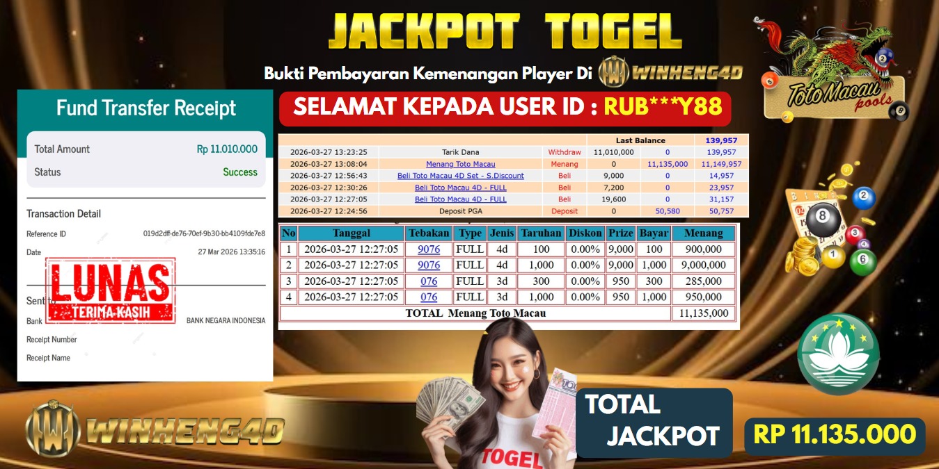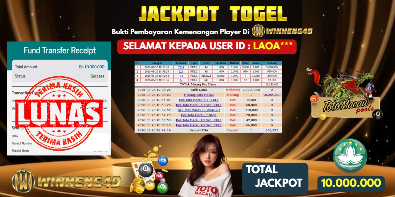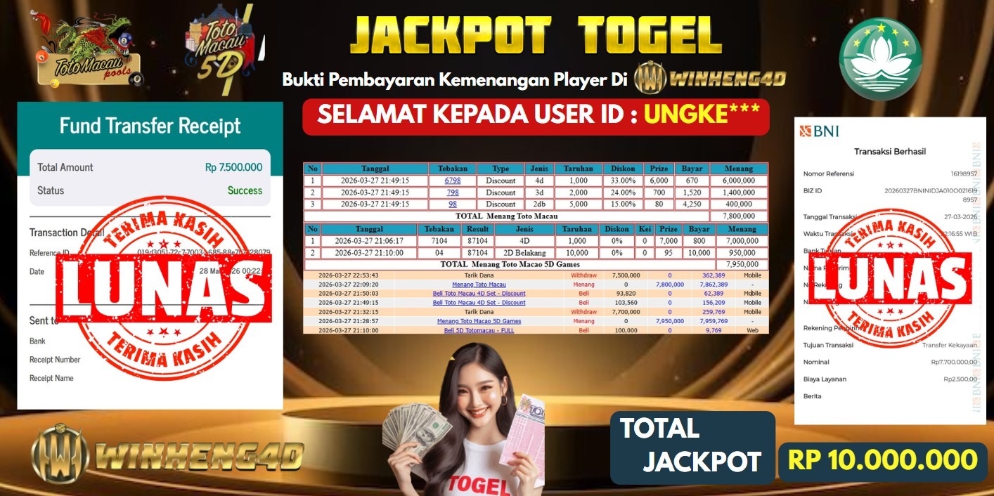 Selamat kepada User ID : UNGKE*** Telah berhasil mendapatkan kemenangan besar pada Permainan JP TOGEL TOTO MACAU DAN TOTO MACAU … Baca selengkapnya...