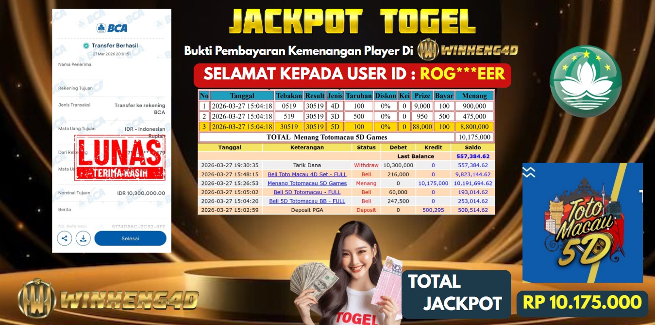 Selamat kepada User ID : ROG***EER Telah berhasil mendapatkan kemenangan besar pada Permainan JP TOGEL TOTO MACAU 5D Dengan kemenangan … Baca selengkapnya...