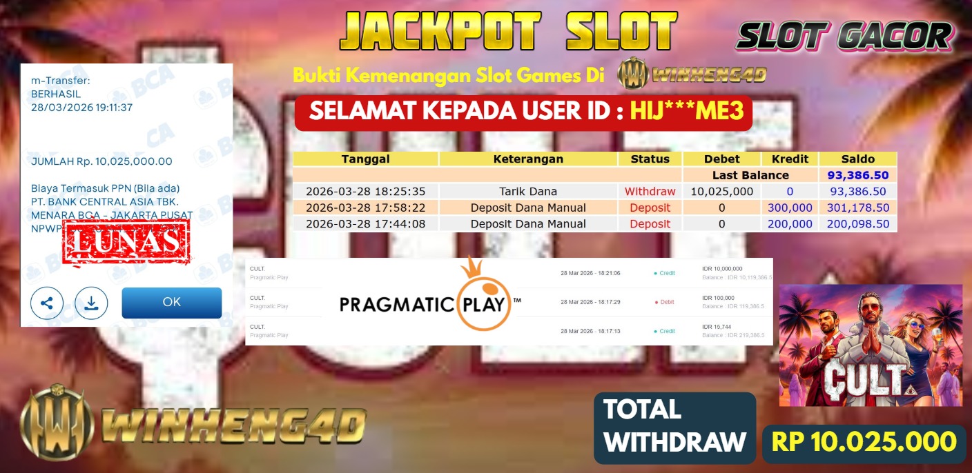 Selamat kepada User ID : HIJ***ME3 Telah berhasil mendapatkan kemenangan besar pada Permainan JP SLOT CULT Dengan kemenangan Sebesar Rp … Baca selengkapnya...