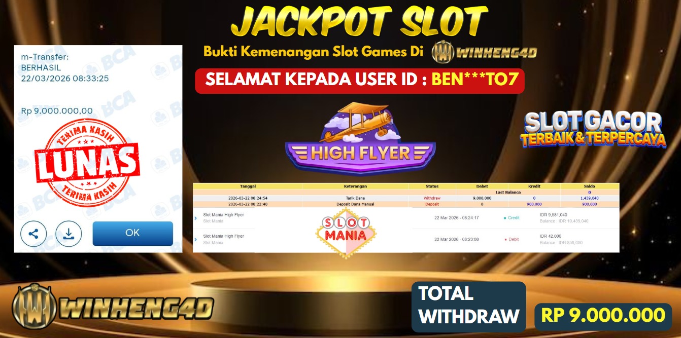 Selamat kepada User ID : BEN***TO7 Telah berhasil mendapatkan kemenangan besar pada Permainan JP SLOT MANIA HIGH FLYER Dengan kemenangan … Baca selengkapnya...