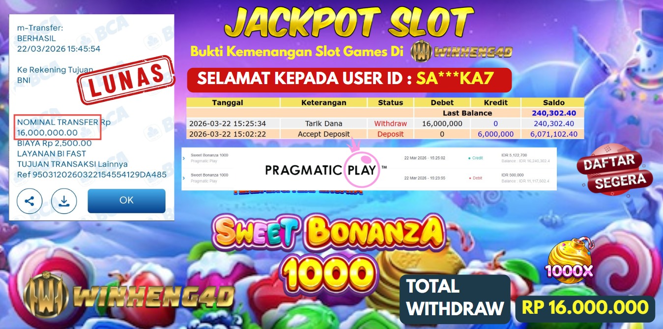 Selamat kepada User ID : SA***KA7 Telah berhasil mendapatkan kemenangan besar pada Permainan JP SLOT SWEET BONANZA 1000 Dengan kemenangan … Baca selengkapnya...
