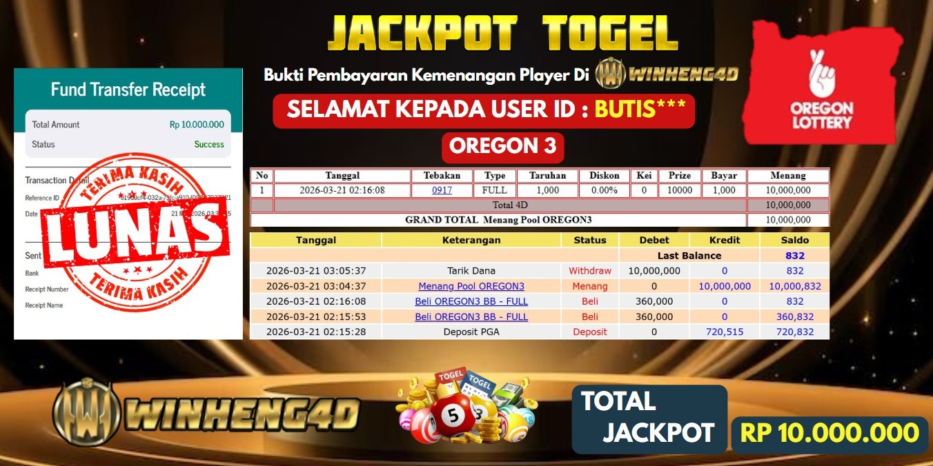 Selamat kepada User ID : BUTIS*** Telah berhasil mendapatkan kemenangan besar pada Permainan JP TOGEL OREGON 3 Dengan kemenangan Sebesar … Baca selengkapnya...