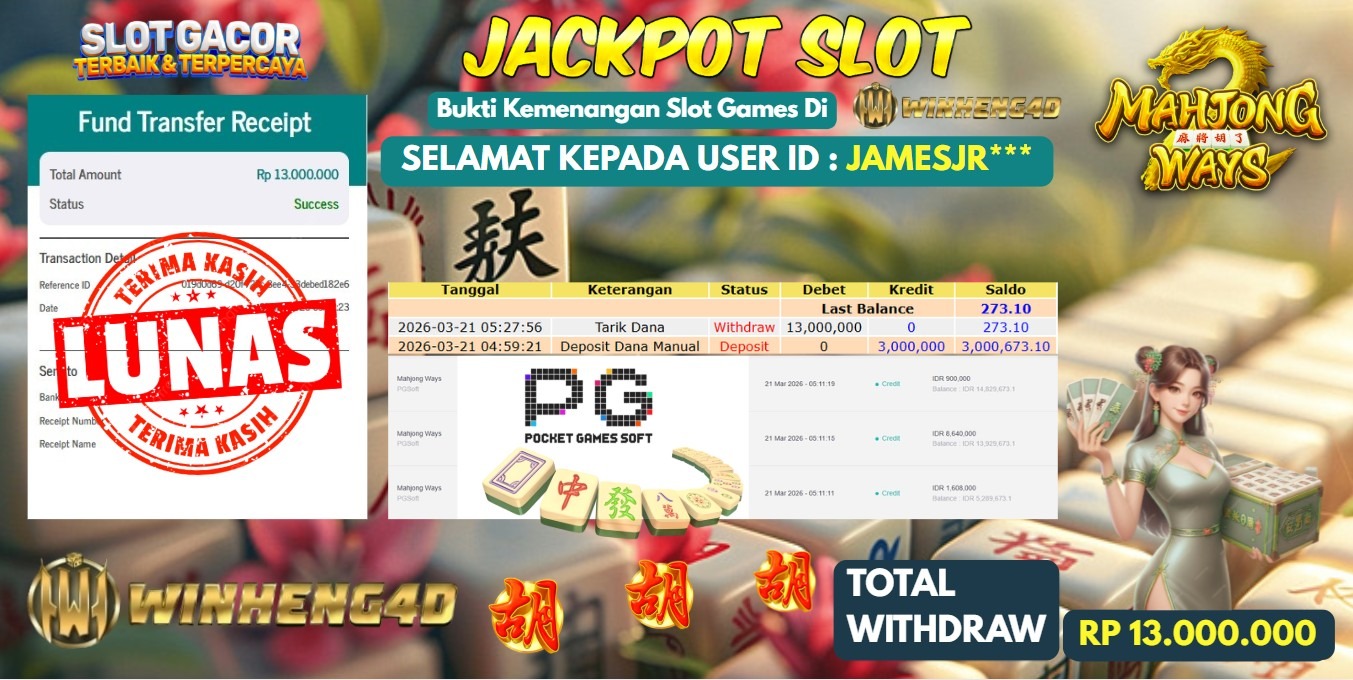 Selamat kepada User ID : JAMESJR*** Telah berhasil mendapatkan kemenangan besar pada Permainan JP SLOT MAHJONG WAYS Dengan kemenangan Sebesar … Baca selengkapnya...