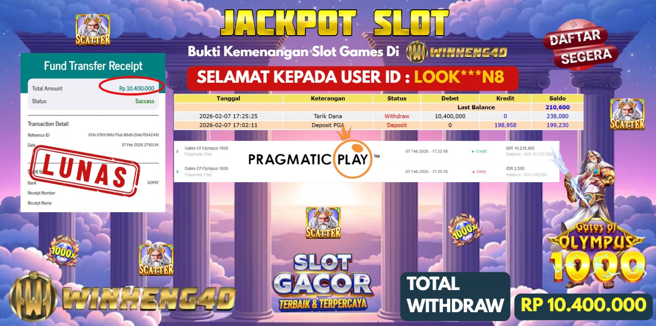Selamat kepada User ID : LOOK***N8 Telah berhasil mendapatkan kemenangan besar pada Permainan JP SLOT GATES OF OLYMPUS 1000 Dengan … Baca selengkapnya...