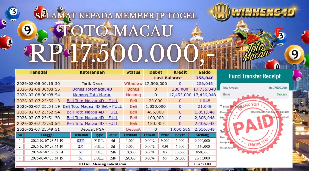 Selamat kepada User ID : KOM***J Telah berhasil mendapatkan kemenangan besar pada Permainan JP TOGEL TOTO MACAU Dengan kemenangan Sebesar … Baca selengkapnya...